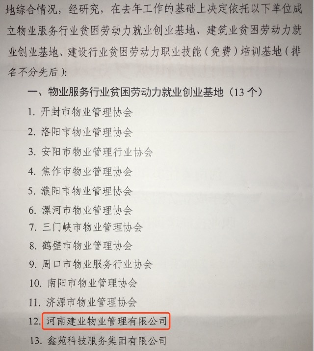 建業(ye)物(wu)業(ye)被(bei)評選為“物(wu)業(ye)服務行業(ye)貧(pin)困勞(lao)動力就業(ye)創業(ye)基(ji)地”