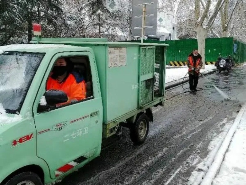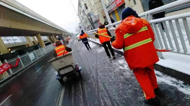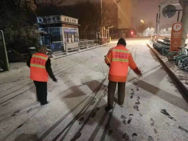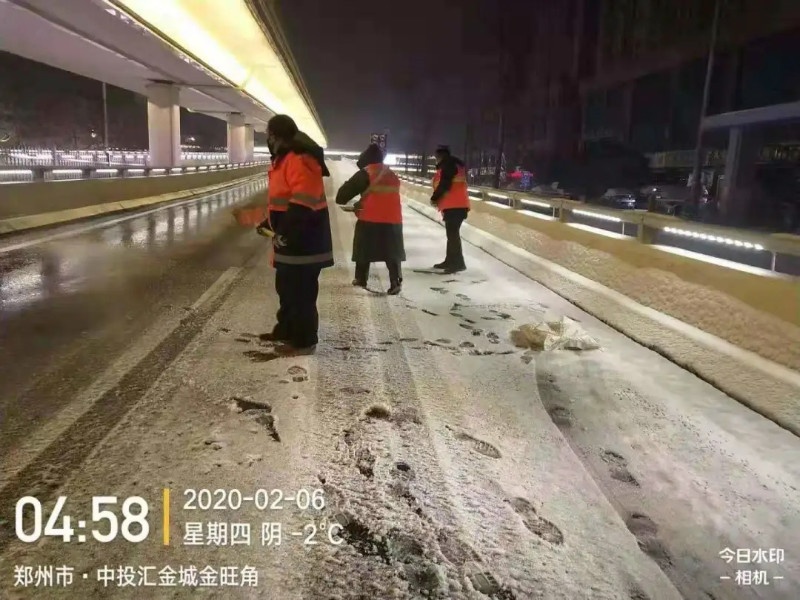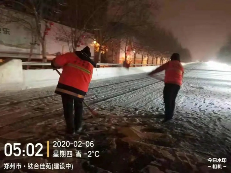 建業物業鄭州二七環衛工人首先在上下橋口、主干道、天橋等地集中撒鹽,緊接著再集中力量,用鐵锨、掃把、推雪板、推雪鏟清理主干道、使用垃圾清運車集中運輸積雪,道路上的積雪清除干凈后,他們并沒有停下來,立即著手使用機械化清掃車進行路面洗掃、沖洗……近8個小時的不間斷作業,終于將一條條主干道清理干凈。
