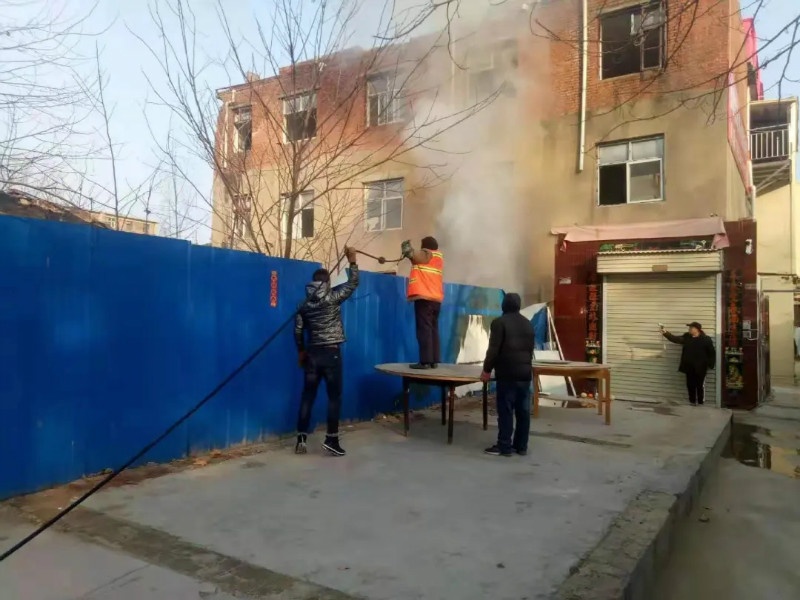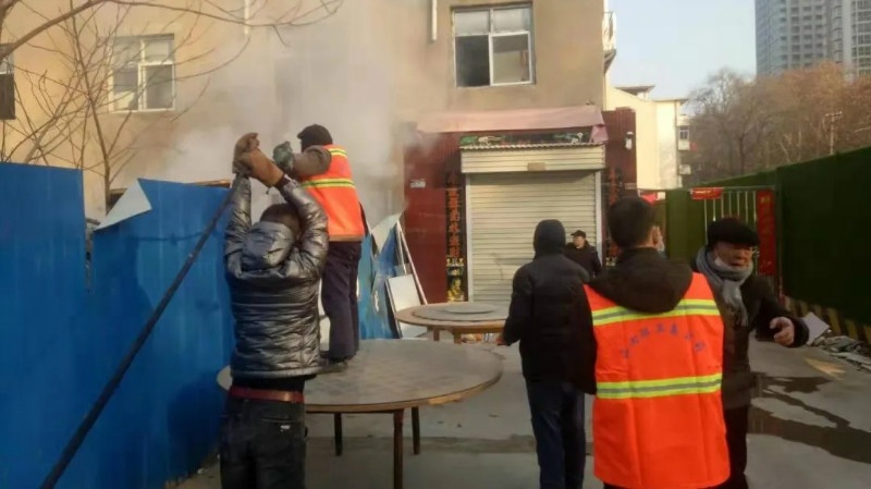 水車到達后,由于道路狹窄且有坡度,水車停在路邊后,趙班長、路班長與環衛司機班員工便拉起水帶,搬來圓桌,站在桌子上向圍擋內噴水。與此同時,附近群眾撥打119報火警,不多時,消防員來到現場,建業物業員工積極協同,一起把火撲滅。