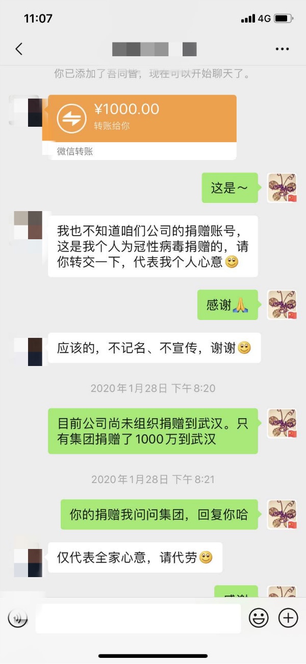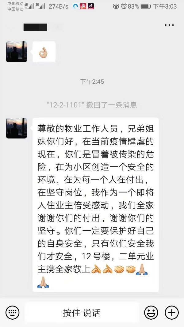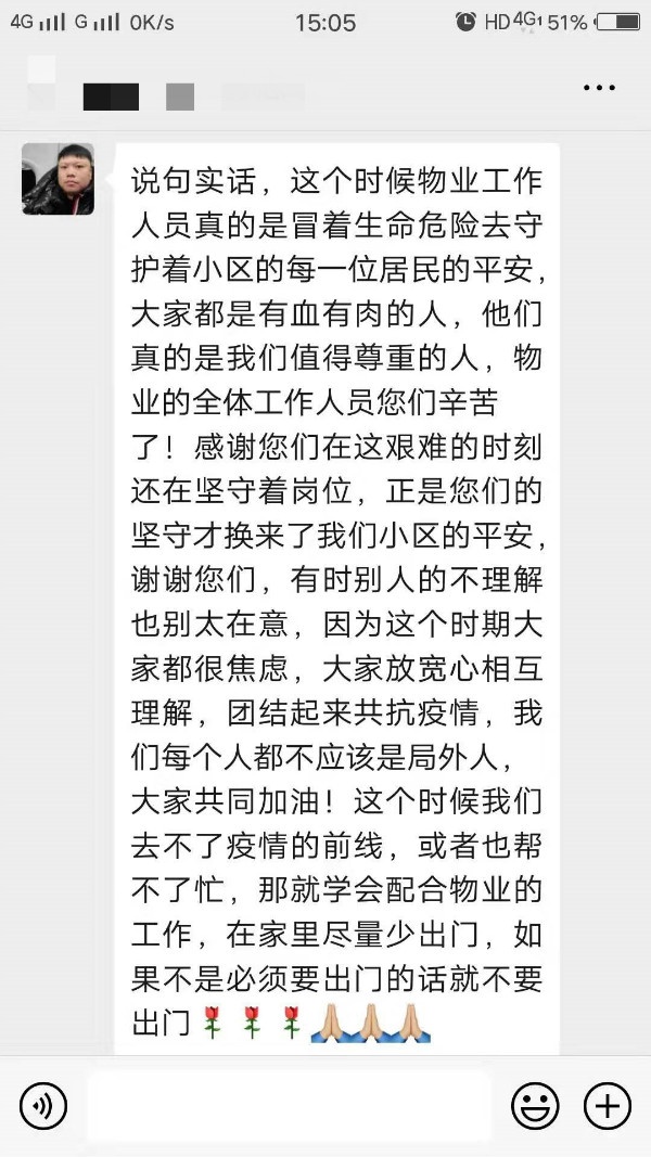 一位建業業主,同時也是集團高層領導,當她看到奮戰在一線、可敬又可愛的建業物業人,每天每一時刻用血肉之軀,筑起業主安全的長城時,特別感動、特別感謝,多次流下眼淚,特發來2萬元紅包給一線的物業員工,助力物業防疫工作的進行!