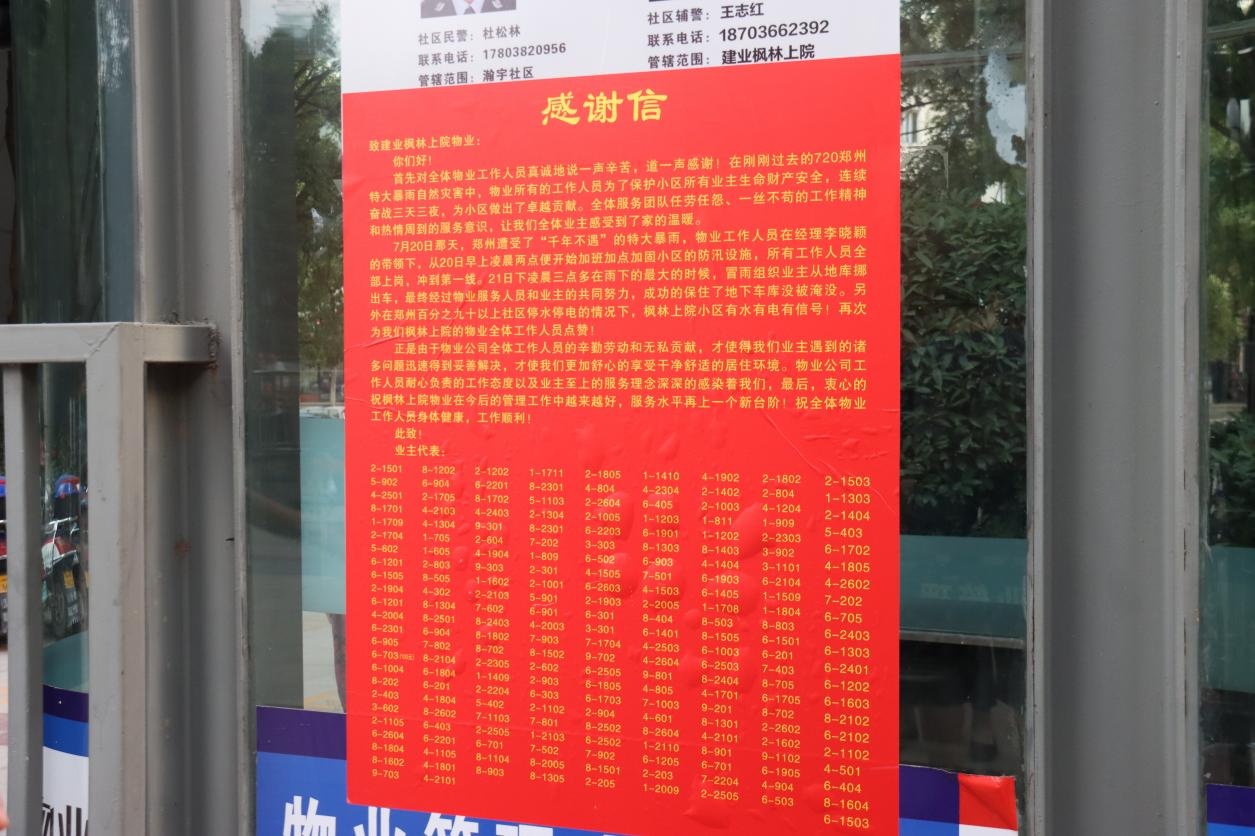 守土盡責,防汛有力丨鄭州·建業楓林上院近300戶業主為物業送錦旗