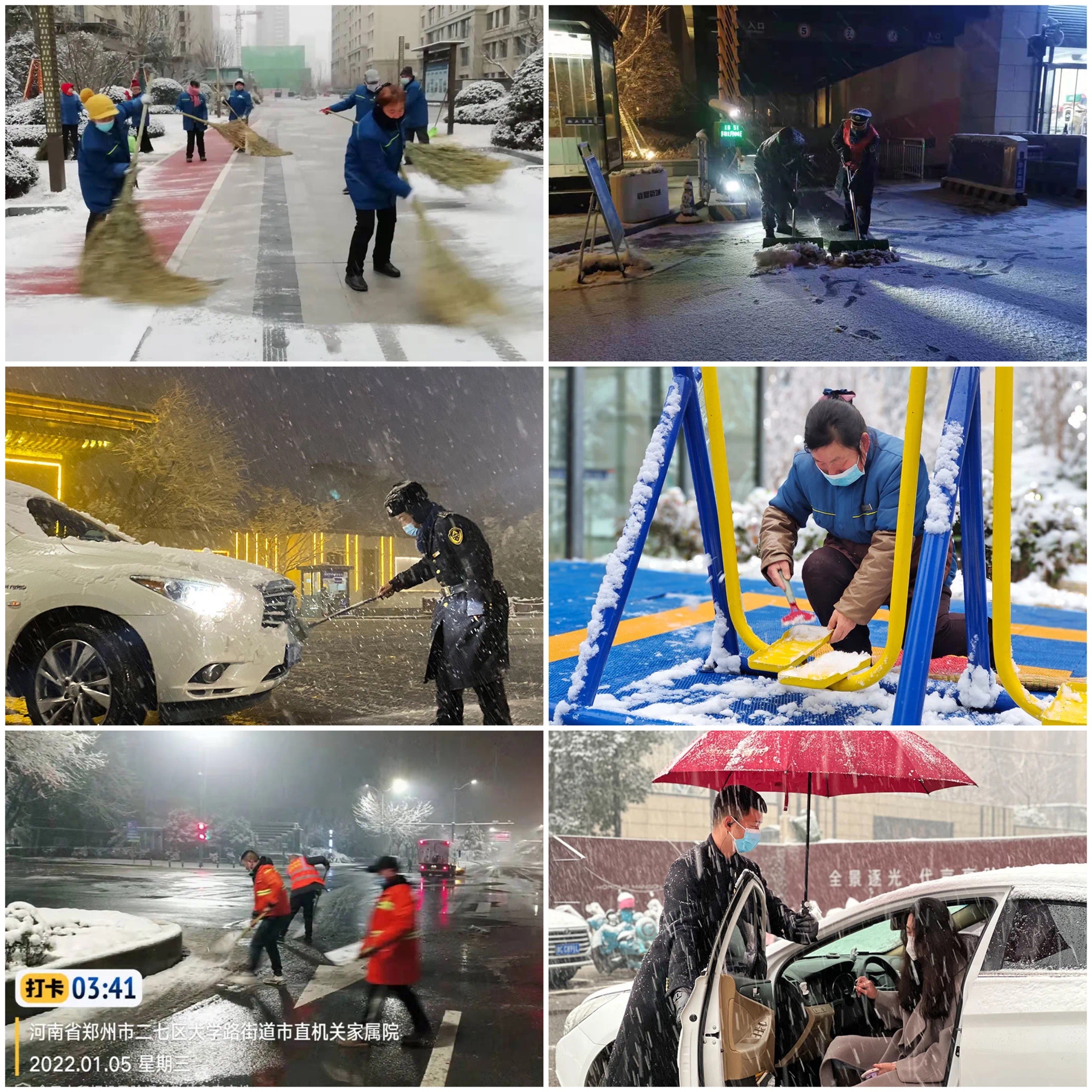 除雪工作不僅在建業物業各小區上演,在鄭州二七片區的街道上,建業物業環衛工人連續奮戰,積極清掃路面積雪。